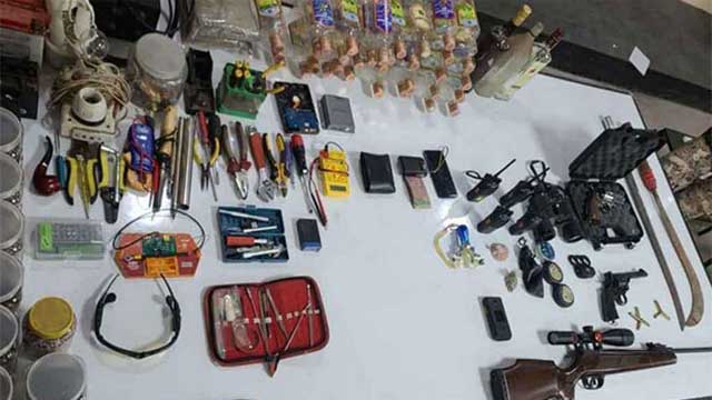 ডক্টরস ইংলিশ নামের ওই প্রতিষ্ঠানে অভিযান চালিয়ে এখন পর্যন্ত দুটি বিদেশি এয়ার গান, একটি রিভলবার, সঠিক কর্টিজ, ইয়ারগান শিশা তিন বক্স, ম্যাগনেট একটি, দেশীয় অস্ত্র ৬টি, জিপিএস একটি, ওয়াকিটকি ৪টি, ট্রাজারগান একটি, সিমকার্ড ১০টি, বাইনোকুলার একটি, বিস্ফোরক তৈরির সরঞ্জাম, পাসপোর্ট, এনআইডি, মনিটর ছয়টি, কম্পিউটার তিনটি, স্ক্যানার তিনটি ও মদের বোতল ৩৫টি উদ্ধার করা হয়েছে বলে জানা গেছে।