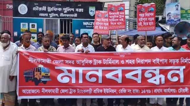 নীলফামারী সদরে আধুনিক ট্রাক টার্মিনাল ও শহর রক্ষায় নিরাপদ বাইপাস সড়ক নির্মাণের দাবিতে মানববন্ধন অনুষ্ঠিত হয়েছে। সোমবার (১৫ সেপ্টেম্বর) সকালে জেলা ট্রাক-ট্যাংকলড়ী শ্রমিক ইউনিয়নের আয়োজনে শহরের ব্যস্ততম চৌরঙ্গী মোড়ে ঘন্টাব্যাপী এ মানববন্ধন অনুষ্ঠিত হয়।