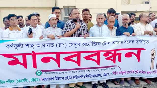 শুক্রবার (১৭ অক্টোবর) বিকালে কর্ণফুলী নাগরিক পরিষদ, সিডিএ কর্ণফুলী আবাসিক প্লট মালিক কল্যাণ সমিতি এবং বাংলাদেশ হিউম্যান রাইটস ফাউন্ডেশন চট্টগ্রাম জেলা শাখার যৌথ উদ্যোগে এ কর্মসূচির আয়োজন করা হয়।মানববন্ধন শেষে বিক্ষোভ সমাবেশে সভাপতিত্ব করেন কর্ণফুলী নাগরিক পরিষদের আহ্বায়ক অ্যাডভোকেট এস. এম. ফোরকান। সমাবেশ সঞ্চালনা করেন বাংলাদেশ হিউম্যান রাইটস ফাউন্ডেশন চট্টগ্রাম জেলা সাধারণ সম্পাদক অ্যাডভোকেট এ. এইচ. এম. জসিম উদ্দিন। বক্তারা বলেন, শাহ আমানত সেতুর টোল আরোপের কারণে কর্ণফুলী দক্ষিণ পাড়ের সাধারণ মানুষ দীর্ঘদিন ধরে আর্থিক ও সামাজিকভাবে ভোগান্তির শিকার হচ্ছেন।তাঁরা বলেন, জনগণের করের টাকায় নির্মিত এই সেতুতে পুনরায় টোল আদায় সম্পূর্ণ বেআইনি ও সংবিধানবিরোধী। সরকার অবিলম্বে টোল প্রত্যাহার করে সেতুটি উভয় পাড়ের মানুষের জন্য সম্পূর্ণ টোলমুক্ত ঘোষণা করুক।