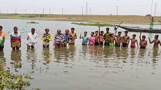 এ অবস্থায় কৃষি ও জীবিকার জন্য নদীর উপর নির্ভরশীল স্থানীয় কৃষক, জেলে ও গোখামারিরা পড়েছেন সংকটে। মঙ্গলবার (৬ মে) দুপুরে তাঁরা পানির মধ্যে দাঁড়িয়ে নদী খননের দাবি করেন।