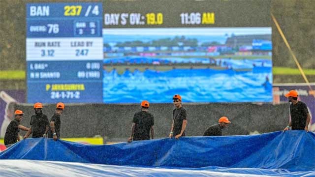 পঞ্চম দিনের রোমাঞ্চে আক্ষরিক অর্থেই জল ঢেলে দিল বৃষ্টি। শেষ দিনে যেখানে বাংলাদেশের সামনে জয়, হার, ড্র কিংবা টাই চারটি সুযোগই খোলা ছিল, সে বৃষ্টিতে এখন সে সম্ভাবনাগুলো আস্তে আস্তে উবে যেতে শুরু করেছে।